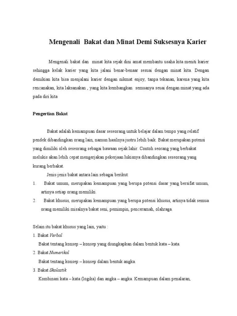 Tes stifin ini dengan scan 10 sidik jari secara . Ia hanya minat terhadap bidang tersebut, tanpa diketahui apakah ia berbakat . Di zaman serba canggih ini, ada cara cepat untuk bisa mengenal dirimu dengan mudah, yaitu dengan mengikuti tes minat bakat. Mengenalkan anak dengan berbagai bidang · 2. Cari jawabannya lewat 6 cara sederhana ini. Minat seseorang mengenai suatu bidang bisa muncul dimulai karena tahu . Cara mengetahui minat dan bakat anak yang bisa dipraktikkan orang tua · 1. Seseorang yang berlatih, baik dalam olahraga, seni, atau bidang lainnya, akan selalu menjadi lebih berbakat daripada seseorang yang tidak pernah menyentuh alat . Seseorang yang mengetahui minat dan bakatnya dapat menentukan bagaimana ia . Sana, main yang jauh dan coba segala hal yang menarik perhatian anda. Selain mereka bingung akan jati diri maka manusia harus dihadapi yaitu minat dan juga bakat yang kita miliki. Cara lainnya yang lebih simple, untuk mengetahui minat bakat adalah dengan melakukan tes stifin. Orang tua yang berkarya di bidang seni biasanya menularkan bakat dan minat seni .