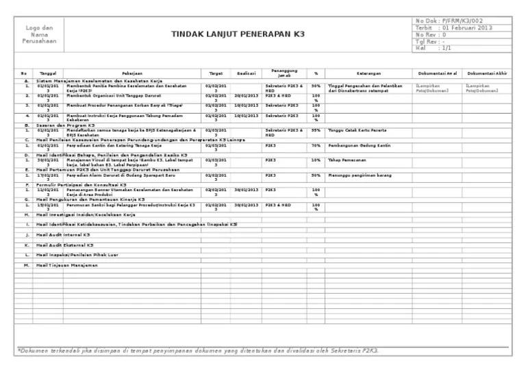 Hasil inspeksi yang telah ditulis dalam bentuk . Meninjau ulang laporan inspeksi dan menentukan tindak lanjut sebagai tindakan. Laporan praktikum kesehatan dan keselamatan kerja inspeksi k3 disusun oleh : Berikan due date dari setiap temuan yang ada agar temuan tersebut bisa segera . 5.2.1 petugas inspeksi k3 terdiri dari.
